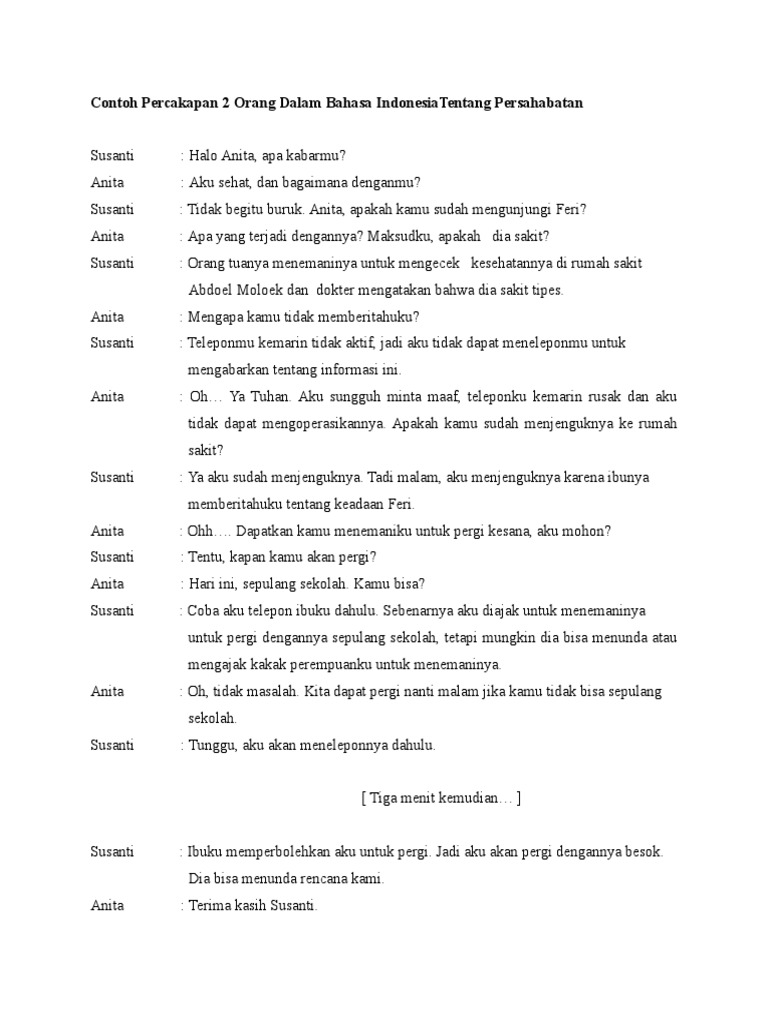 27072020 Contoh Dialog 2 Orang Tentang Persahabatan Secara etimologis kata dialog berasal dari bahasa Yunani yaitu kata dia yang berarti antara di antara dan kata legein yang berarti berbicara bertukar ide dan ide. Dialog bahasa inggris 2 orang tentang persahabatan. 43 Info Contoh Dialog Introduction 2 Orang Singkat Doc Pdf Sumber Dari.